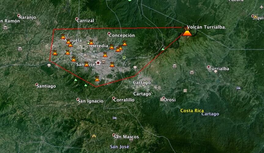Impacto local. La erupción del volcán Turrialba es (todavía no puedo decir que “era”) un evento que tiene a Costa Rica en observación porque a lo largo de estos últimos días no ha dejado de expulsar cenizas, además impulsadas por el fuerte viento, recorriendo varios kilómetros del país hasta llegar a lugares económicamente estratégicos, como son los aeropuertos, logrando suspender vuelos nacionales e internacionales en los dos aeropuertos ubicados en la Gran Área Metropolitana; pueden apreciar el gráfico . Esta suspensión de vuelos se hizo por acumulación de ceniza en las pistas de aterrizaje, no así por riesgos en el aire.