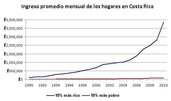 Este gráfico fue elaborado por mi amigo Alejandro Fernández, periodista de El Financiero, usando datos del INEC. Muestra muy claramente cómo el ingreso del 10% más rico de los costarricenses se ha disparado desde 1990, mientras que el del 10% más pobre se ha mantenido básicamente estancado durante la mayor parte de dicho período, con un leve aumento en los últimos años. Esto coincide con lo reportado a inicios del año por El Financiero de que Costa Rica es uno de los dos únicos países latinoamericanos donde la desigualdad aumentó en la última década. ¿Nos debería importar?