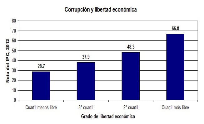Pero, ¿qué hace que unos países sean más corruptos que otros? Pues a partir del IPC de Transparencia Internacional, podemos hacer un ejercicio interesante comparándolo con el Índice de Libertad Económica (ILE) que todos los años publica el Fraser Institute de Canadá. El ILE mide el grado de intervencionismo del Estado en diversas áreas de la economía: política fiscal, derechos de propiedad, politica monetaria, política comercial y regulaciones. Puede leer la metodología así como acceder a todo el informe del 2011 en español aquí.