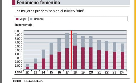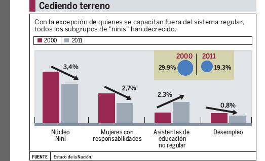 A principios del milenio, un 23,9% del total de la población costarricense en ese rango de edad encajaba en el perfil de los “ninis”. Once años después, el porcentaje se redujo a 19,3%, según una investigación del programa Estado de la Nación con base en los datos de los censos del Instituto Nacional de Estadística y Censo (INEC).