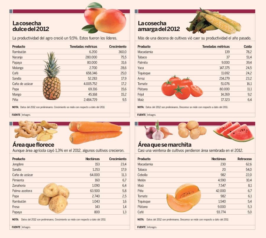 Por ejemplo, el cultivo que más aumentó su productividad en el 2012 fue el rambután, pero antes de proclamarlo como el campeón del sector agrícola, se debe tomar en cuenta lo relativamente pequeño de su aporte al total verde: 0,05%del total.