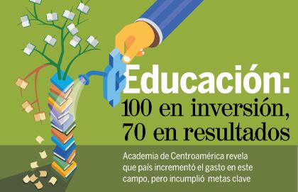 La inversión en educación, sin considerar el gasto en universidades, más que se duplicó en dos décadas. Aumentó de 2,6% del Producto Interno Bruto (PIB) en 1994 a 5,9% en 2014. El nivel de gasto en educación realizado por Costa Rica en 2009 es mayor al ejecutado por países con similar ingreso per cápita e incluso mayor al de varios países de la Organización para la Cooperación y el Desarrollo Económio (OCDE).