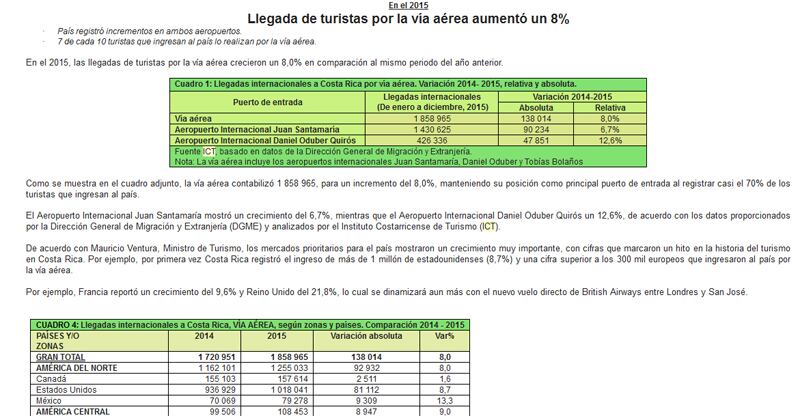 La siguiente es una imagen parcial de un comunicado oficial del ICT enviado a la prensa el 18 de enero en el cual informa sobre las cifras en términos de número de "turistas" y no de "llegadas internacionales", contradiciendo lo recomendado por la propia jefa de administración de información del ICT, Roxana Arguedas, por resultar impreciso.