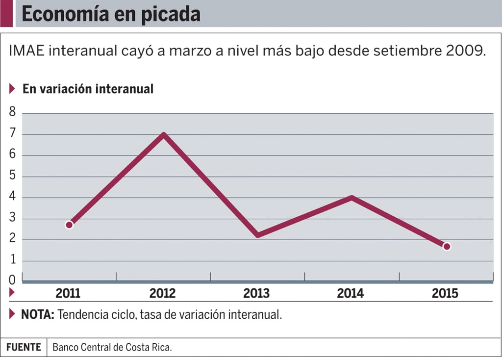 Según el Índice Mensual de Actividad Económica (IMAE), que publica el Banco Central de Costa Rica (BCCR), la economía se empezó a desacelerar a partir de julio del 2014, hasta alcanzar su dinamismo más raquítico desde setiembre del 2009 en marzo, cuando registró un crecimiento interanual de un 1,7%.