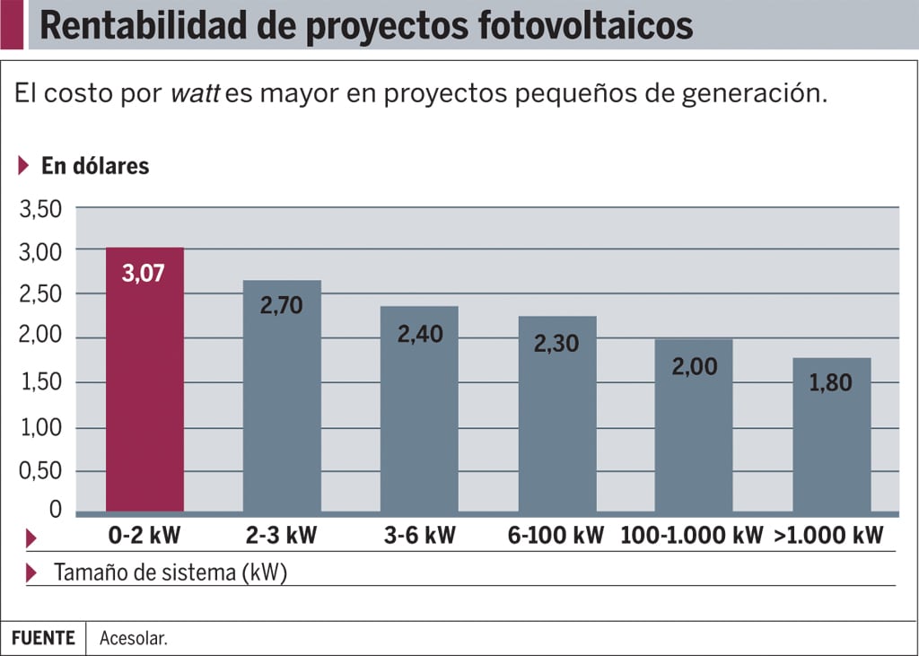 Acesolar va más allá. Con base en los cálculos de esa organización, la generación distribuida que inyecta electricidad con fuente solar a la red eléctrica nacional estaría, en pocos años, en capacidad de cubrir casi toda la demanda de energía del país. Esto cuando se reduzca el precio de los sistemas de almacenamiento que permitirían mitigar la variabilidad de la fuente solar y se incentive el crecimiento de los pequeños proyectos de esta generación, pues los grandes tienen rentabilidades mayores por cada watt instalado.
