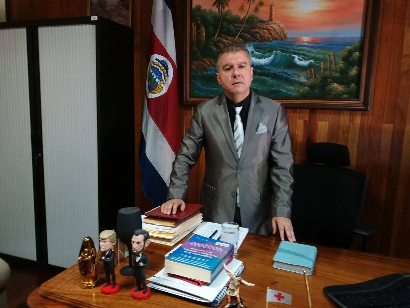 Sería incómodo trabajar siempre con una Biblia al frente del teclado, pero también parece agradarle. Un cáliz negro desfila por su mesa y dos muñecos de Donald Trump y Abraham Lincoln le envían saludos a los visitantes. También hay una bandera de Cruz Roja, "en agradecimiento por su apoyo al proyecto 19.234", que transforma el financiamiento de la Cruz Roja Costarricense.