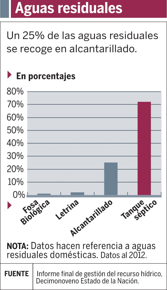 Costa Rica tiene una tasa de saneamiento de un 3,4%, la más bajo de Centroamérica y el alcantarillado existente solo transporta el 25% de las aguas contaminadas.