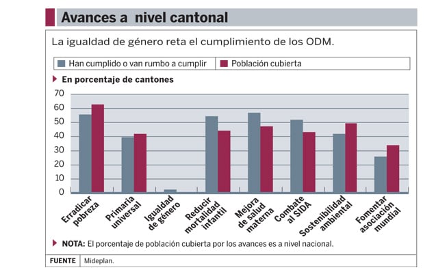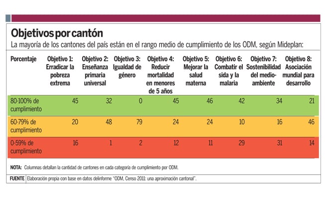 Según el informe al 2012 sobre los avances de los ODM, un 22% de los cantones se encontraba en la categoría de entre 0 y 59% de cumplimiento del objetivo.