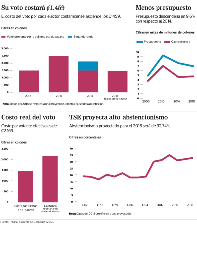 La posibilidad de que usted vote en febrero de este 2018 tiene un costo para su bolsillo y el de otros contribuyentes. El monto corresponde a¢1.459 por elector, una cifra que podríaascender en poco más deuna cuarta parte si el país decidiera ir a una segunda ronda.