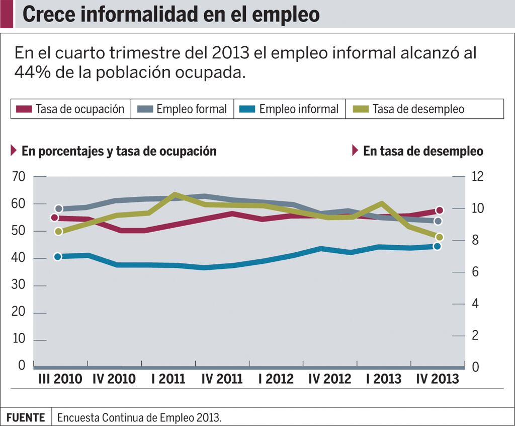 Según la Encuesta Continua de Empleo (ECE), que se realiza cada tres meses, en el cuarto trimestre del 2013 un 44% de las personas ocupadas trabajaba en condiciones de informalidad.