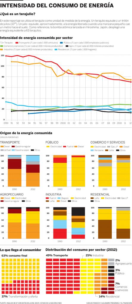Producción: Para el sector industrial, comercial, de servicios y el agro, la unidad de medida son los terajulios consumidos por cada ¢1.000 millones del PIB constante respectivo de cada sector.