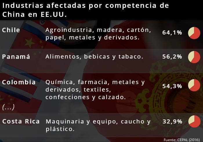 La competencia de China, que hoy amenaza a un 38% de las exportaciones de la región latinoamericana muestra signos vitales fuertes y construye un panorama de preocupación e interés para los países de América Latina y el Caribe. Hacia el 2013 China acaparó una cuota en el mercado de importaciones de Estados Unidos mucho mayor a la de todos los países latinoamericanos y caribeños juntos. Hoy un 22% de los productos que importa Estados Unidos provienen de ese país. Solo un 18% de las importaciones de EE.UU. proceden de América Latina y el Caribe.
