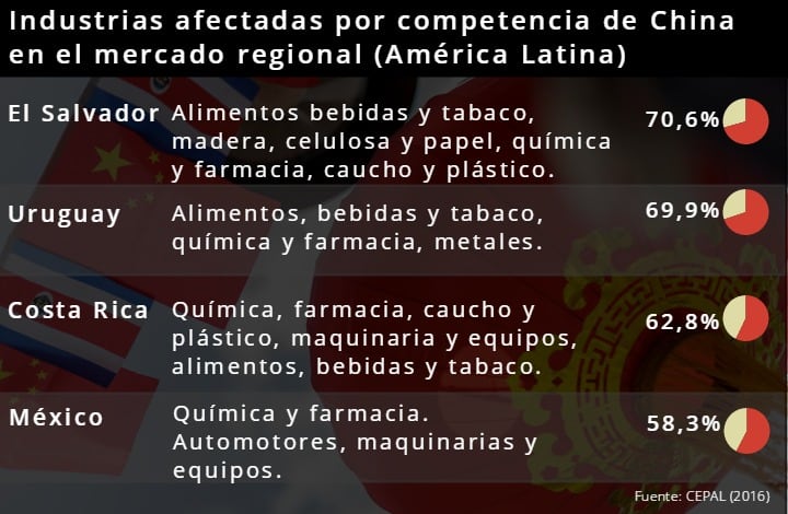 Eso crea una competencia en el comercio, tanto con Estados Unidos como con nuestros propios vecinos. La competencia se cierne especialmente sobre las industrias manufactureras, con énfasis en la venta de alimentos, bebidas, textiles o confecciones, quienes pierden cada año más terreno frente a los productos asiáticos.