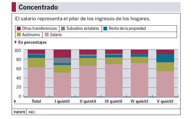Si bien el salario representa el grueso del dinero que perciben los hogares en el país, su peso varía cuando estos se agrupan por nivel de ingreso.