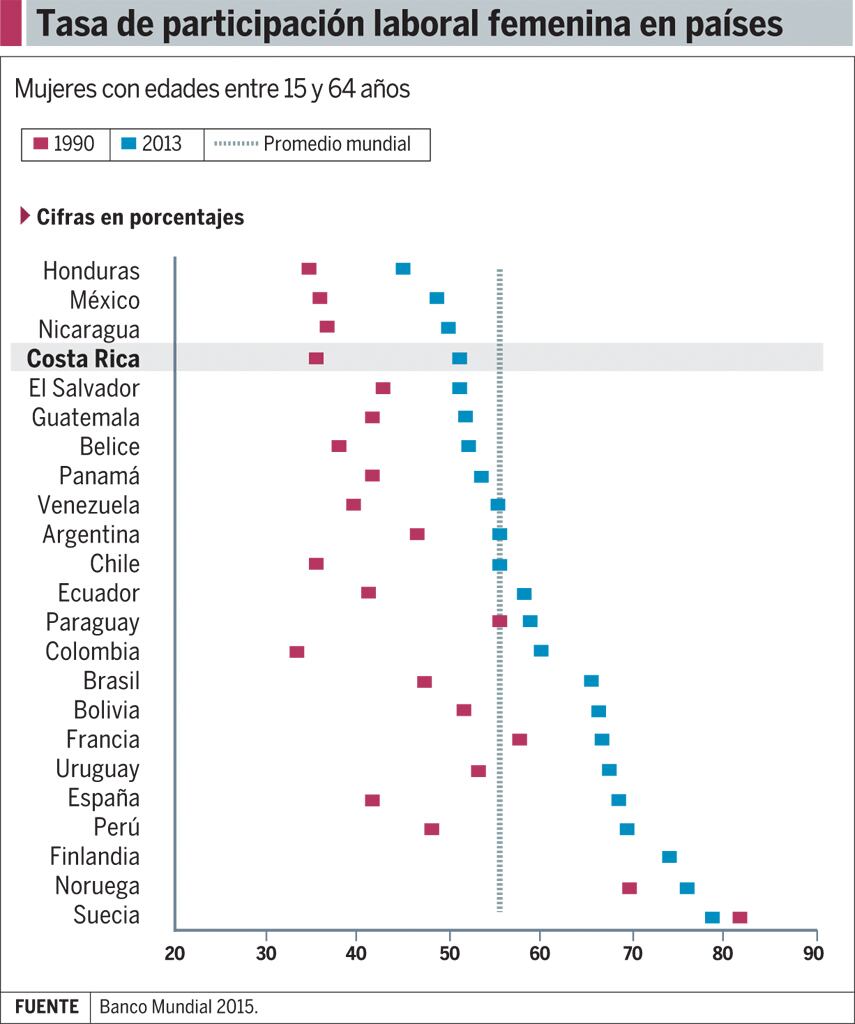 Costa Rica sobresale como el cuarto país de América Latina con la menor tasa de participación laboral femenina (un 55%).