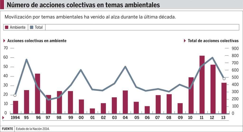 Durante los veinte años analizados (1994-2013) por el Estado de la Nación, la presencia del tema ambiental en la movilización social tiene niveles cambiantes.