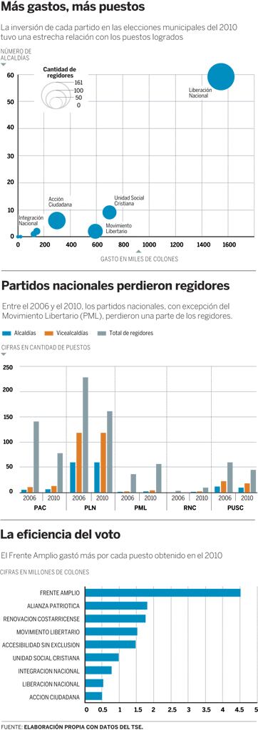 Aunque existe una fuerte correlación estadística entre el gasto en campaña municipal y la cantidad de puestos logrados en el 2010, el resultado no implica que una inversión mayor sea la única causa de una mayor cantidad de puestos logrados.