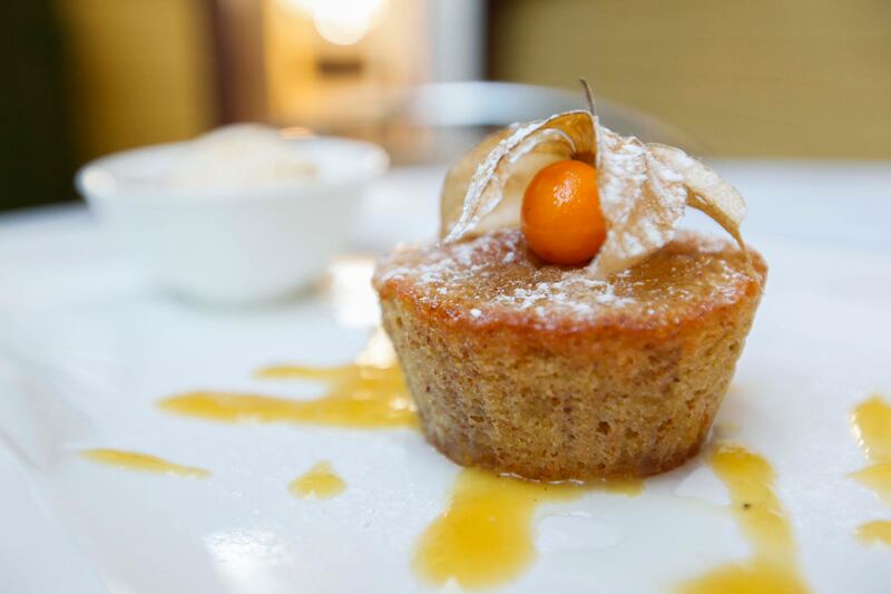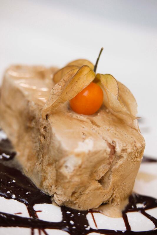 Fondant pithiviers , queque de almendras, acompañado con helado de ron con pasas, coronado con una colorida uchuva, que con su belleza hace honor a su sobrenombre de fruta del amor. Delicada y nada empalagosa esta receta que data del siglo XVII.