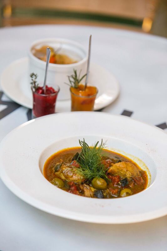 Tajín especial La Terrasse . Guiso de pollo a la miel, canela, aceitunas, vegetales y especias. Acompañado de cuscús y chutney de manzana y ciruela. Sabor original, emplatado con acierto y francamente delicioso.