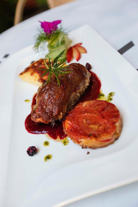 Pechuga de pato, flambeada con whisky, con salsa de vino tinto y moras. Servida en una sola pieza, en punto medio de cocción, gustosa y suave, le encantó a nuestra invitada. Acompañada de crumble de tomate (con una muy buena textura), y unas riquísimas papas gratinadas ( dauphinoises ).
