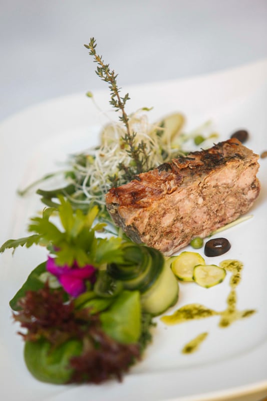 Paté casero de cerdo con hierbas de Provenza , exquisito, acompañado de pepinillo, mezclum de lechugas fresquísimas y un pan francés a la altura del componente principal.