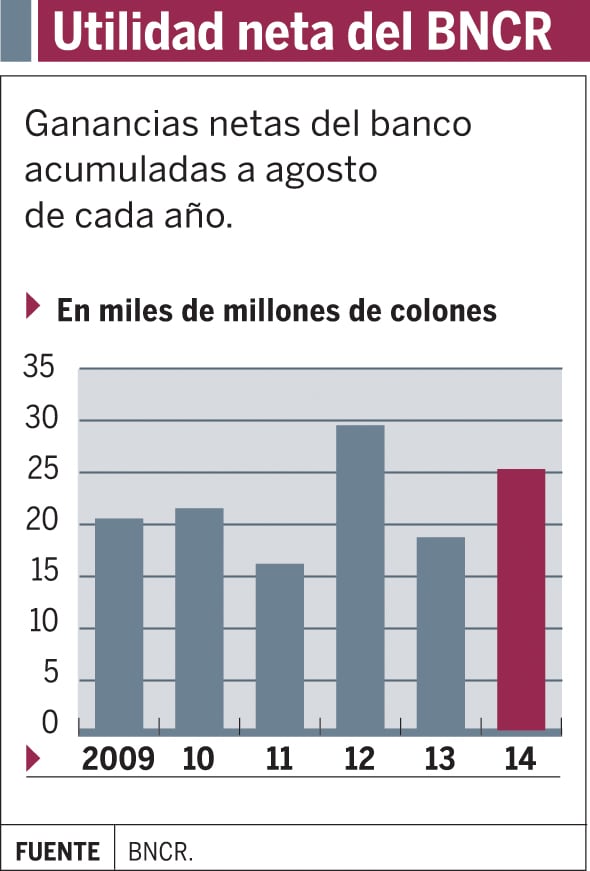 El 2013 golpeó al BNCR con un menor crecimiento de su utilidad neta. Según los estados financieros auditados, el descenso para ese año –con respecto al 2012– fue de 44% en términos reales. La ganancia cerró en ¢25.141 millones.