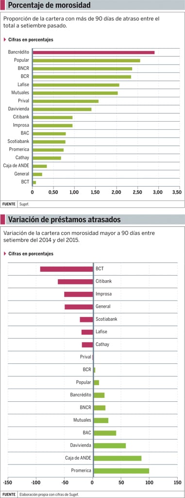 Por ejemplo, entre los privados, el BAC San José es el que tiene la cartera de créditos más abultada y también el mayor monto con atrasos superiores a los 90 días, pero su indicador ante Sugef es bajo (0,79%).