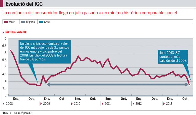 Desde febrero del 2011 y hasta la fecha, el ICC muestra una tendencia decreciente que refleja desconfianza en el consumidor, pues se mantuvo con valores menores de cinco puntos.