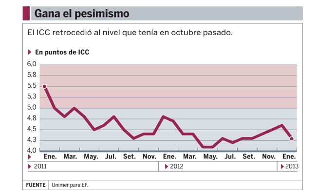 El Índice de Confianza del Consumidor (ICC) cayó un 6,5%, es decir, 0,3 puntos, lo mismo que mensualmente había sumado entre noviembre del 2012 y enero del 2013.