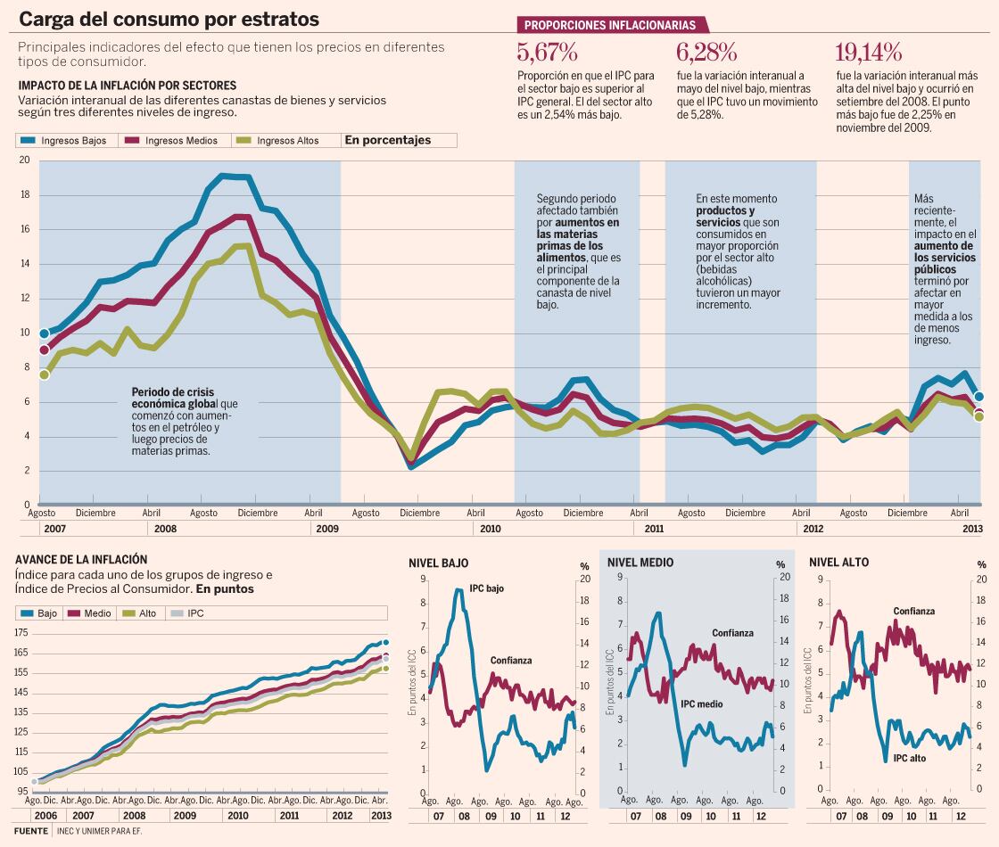 Es de esta manera, por medio de un mayor o menor peso de los grupos de productos y servicios dentro de los grupos de población, que se logran las diferentes variaciones del índice, y no porque específicamente suban o bajen los precios que afecten más a determinado grupo de ingreso económico.