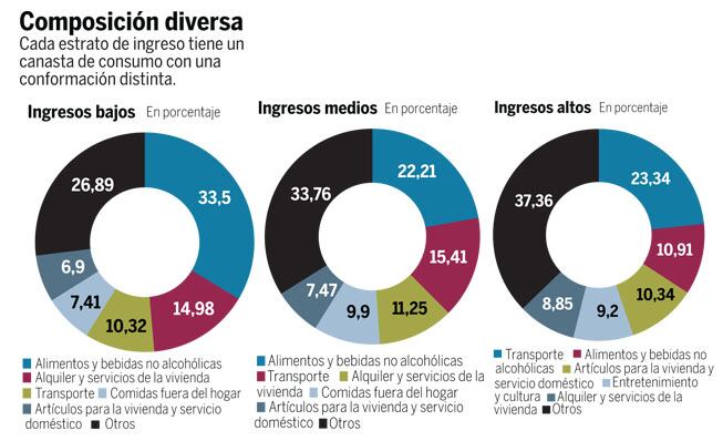 En los ingresos bajos está el 30% de los hogares, con el 13% del gasto total. Para el índice medio está el 50% de las familias, con un 43% de todo lo que se gasta.