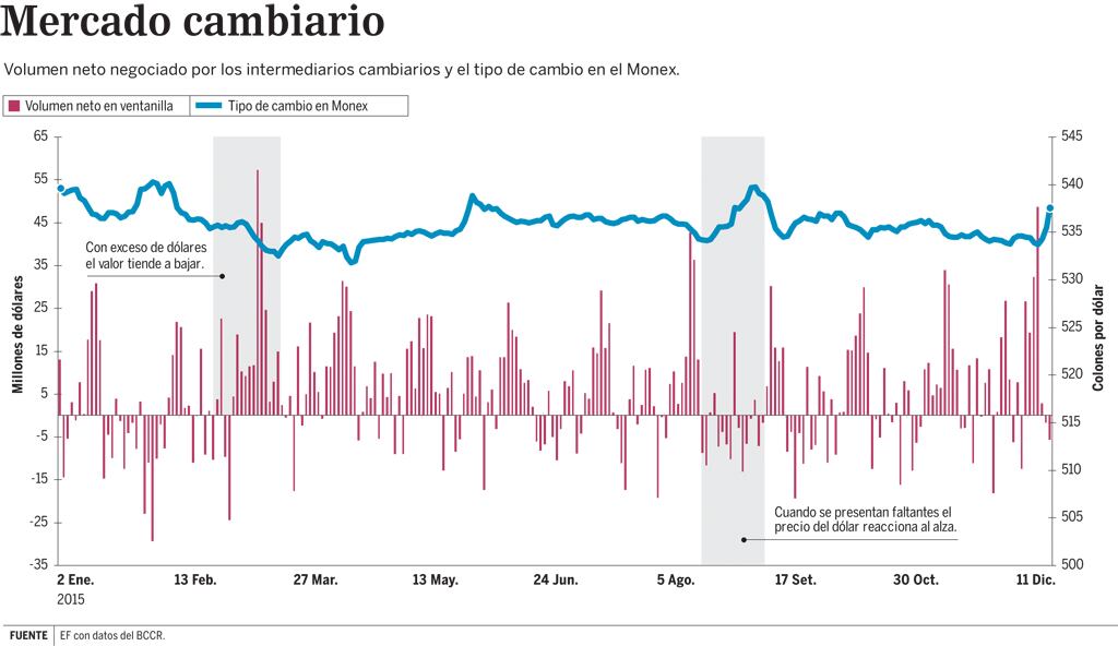 El mercado cambiario costarricense tuvo un exceso de dólares en el 2015. De las transacciones hechas por los intermediarios con personas y empresas, el sobrante (al 18 de diciembre pasado) era 1,4 veces más grande con respecto al del 2014.
