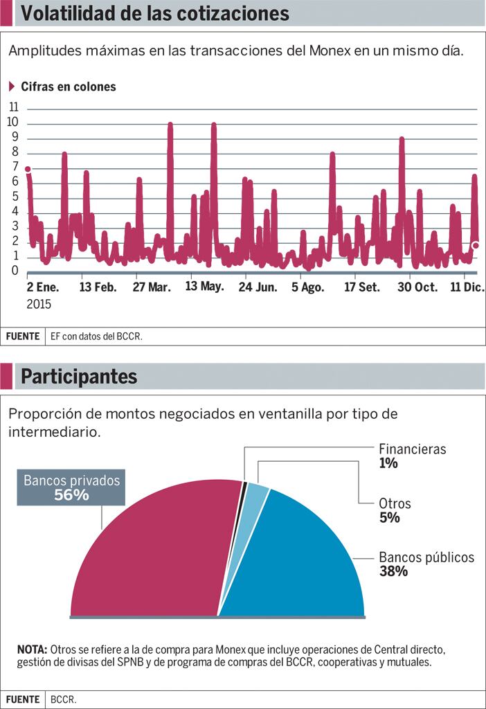Los dólares que compran y venden los intermediarios con el público conforman el mercado de ventanilla. Por volumen, este es más grande si se compara con el Mercado de Monedas Extranjeras (Monex) del Banco Central de Costa Rica (BCCR), donde solo participan entidades financieras, empresas y personas que negocien más de $1.000 por vez.
