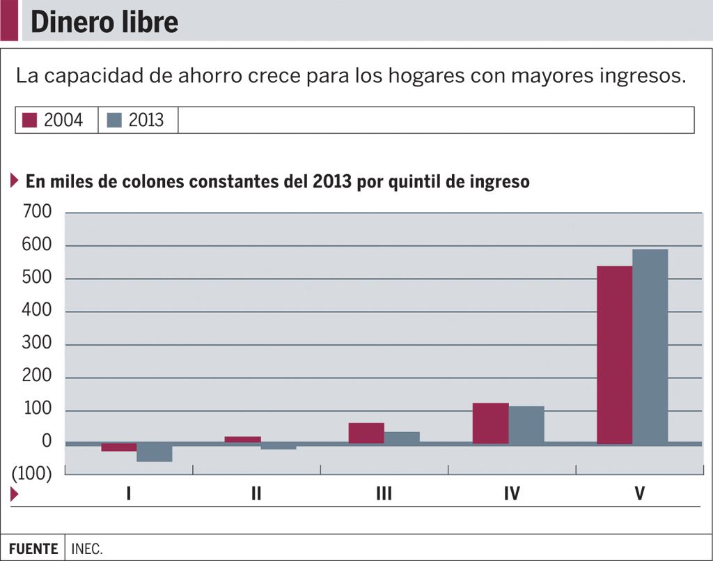 “Tenemos menor proporción de hogares con diferencias positivas a favor del ahorro en el 2013, con respecto al 2004. Se da porque los niveles de gasto en general para todos los hogares de todos los quintiles, crecieron en promedio más que los niveles de ingreso”, aseguró Annia Chaves, coordinadora de la encuesta en el Instituto Nacional de Estadística y Censo (INEC).
