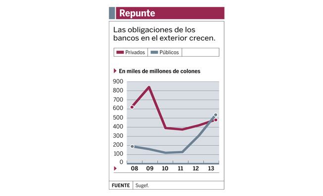 Entre los bancos privados ha sido menor el ritmo de crecimiento de los fondos que piden prestado a entidades del exterior (14% entre febrero de 2013 y el mismo mes de 2012), aunque representan una porción más grande de sus pasivos con costo (12%).