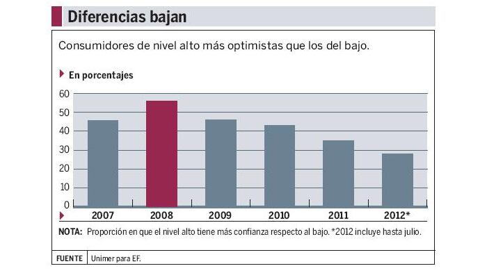 Así, el segmento alto pasó de ser un 56% más optimista que el grupo de bajos ingresos en el 2008 a un 34% más confiado en el 2011.