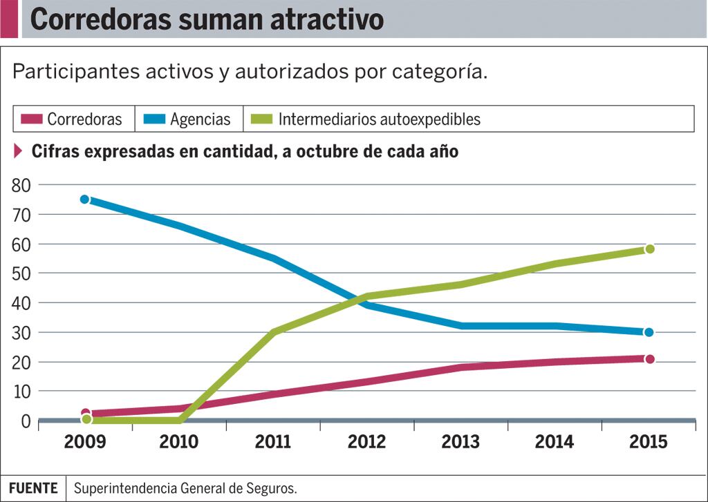Mientras, las agencias redujeron su participación de 75 a 30 intermediarios en ese mismo periodo, según la Superintendencia de Seguros (Sugese).