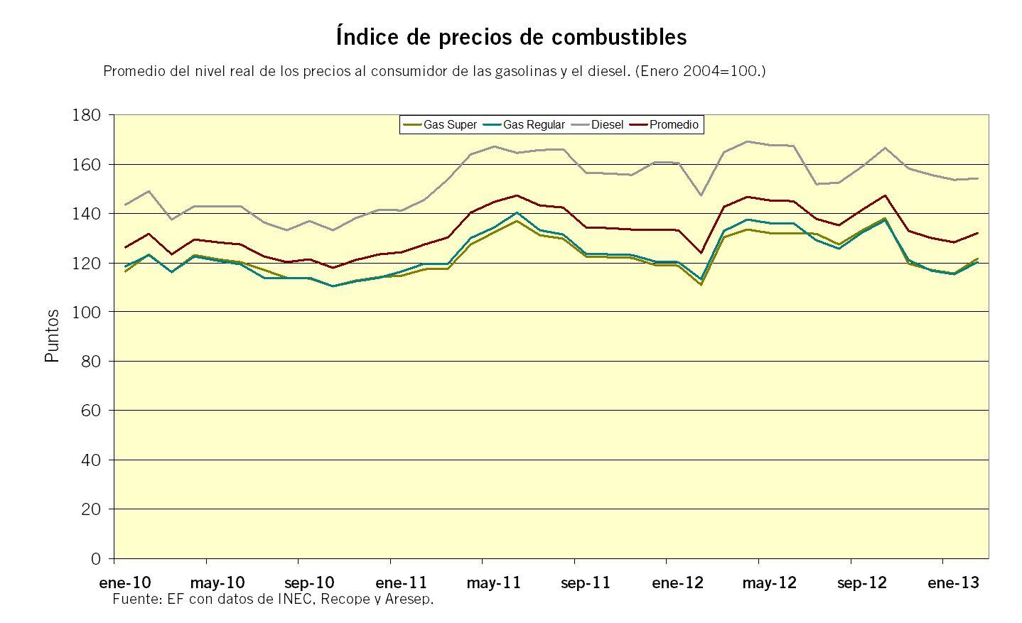 Solo para la gasolina Súper, el aumento con respecto a febrero del 2012 fue de 9,6%; para la gasolina regular fue de 6,1%, y para el diesel de 4,7%. Todos los anteriores con variaciones reales provenientes de un índice elaborado a partir de los valores al consumidor y del Índice de Precios al Consumidor (IPC).