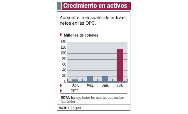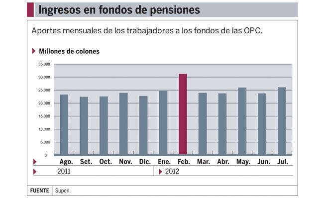 Según datos remitidos a EF por la Superintendencia General de Pensiones (Supen), de agosto del 2011 a julio del 2012, el promedio de aportes por mes que reciben las operadoras de pensiones complementarias (OPC) es de ¢24.500 millones.