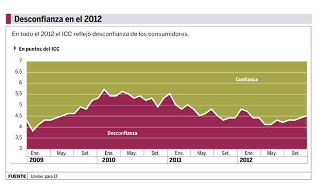 De los ocho años de existencia que tiene el Índice de Confianza del Consumidor (ICC) de EF, el 2012 fue el segundo en el que el indicador demostró desconfianza en los 12 meses consecutivos del calendario.