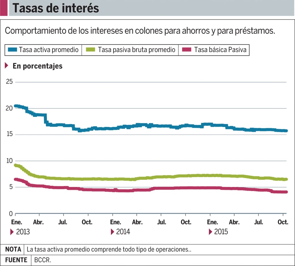 | La tasa de interés que los bancos aplican a sus préstamos  viene a  ser el precio al que ofrecen su servicio. Este valor depende de  múltiples factores:  uno es lo que pagan por los ahorros de personas y  empresas (tasas de captación) y otro es el plazo que tienen para  disponer de esos recursos. De esa manera, no hay un solo precio. Por ese motivo, aunque baje la Tasa Básica Pasiva (TBP), no significa que todos los costos de captación tendrán la misma tendencia. Debido a que a mayor plazo, las tasas de interés son superiores, si una entidad bancaria tiene concentrada su captación en periodos largos, también deberá enfrentar mayores costos. Además, cuanto más largo sea el plazo, más tiempo deberá esperar el ahorrante, el banco y el deudor para tener un cambio en sus intereses. Los bancos también incluyen sobre la tasa activa (de los créditos) la utilidad esperada cuando fijan el margen sobre las tasas de captación. La proyección de los ingresos y ganancias es importante debido a que cubren las estimaciones (por créditos atrasados) y se llega a la rentabilidad deseada, que a su vez es observada por la Superintendencia General de Entidades Financieras (Sugef). |