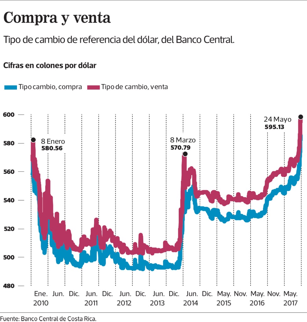 Esa cifra representa una devaluación del colón de 10% (¢55 más por dólar) respecto del año pasado, o del 7% (un cambio de ¢39) respecto del inicio de este 2017.