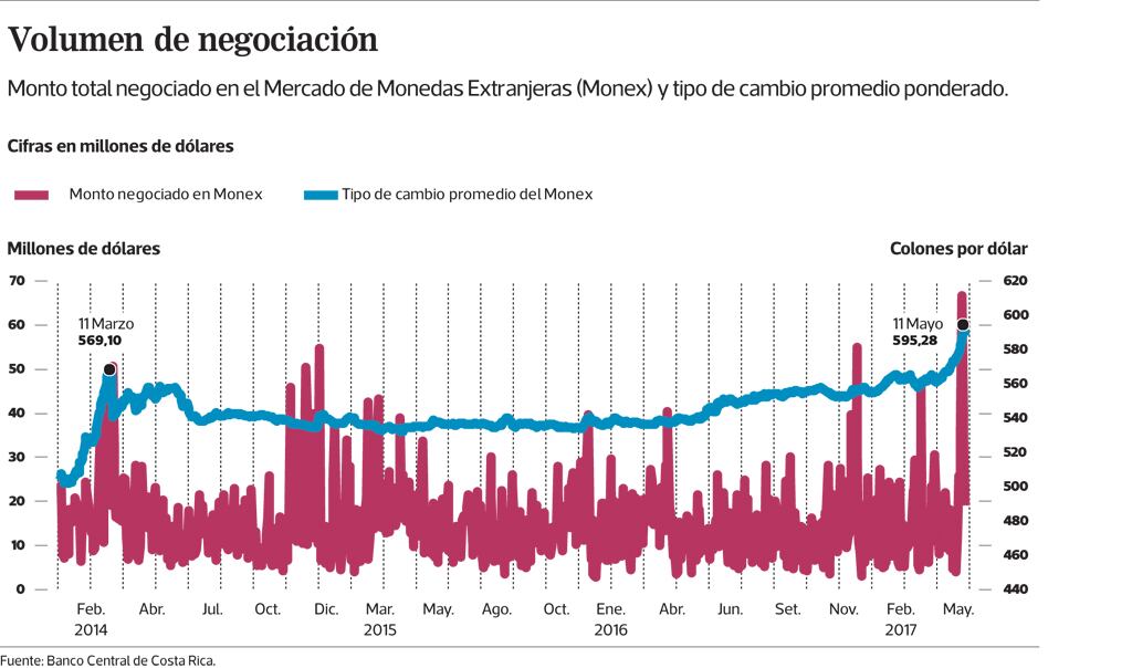 El 24 de mayo, el tipo de cambio promedio del Mercado de Monedas Extranjeras (Monex) llegó a ¢595,28 por dólar, dato que supera lo visto en 2009, cuando se registró la cifra más alta (¢591,93).