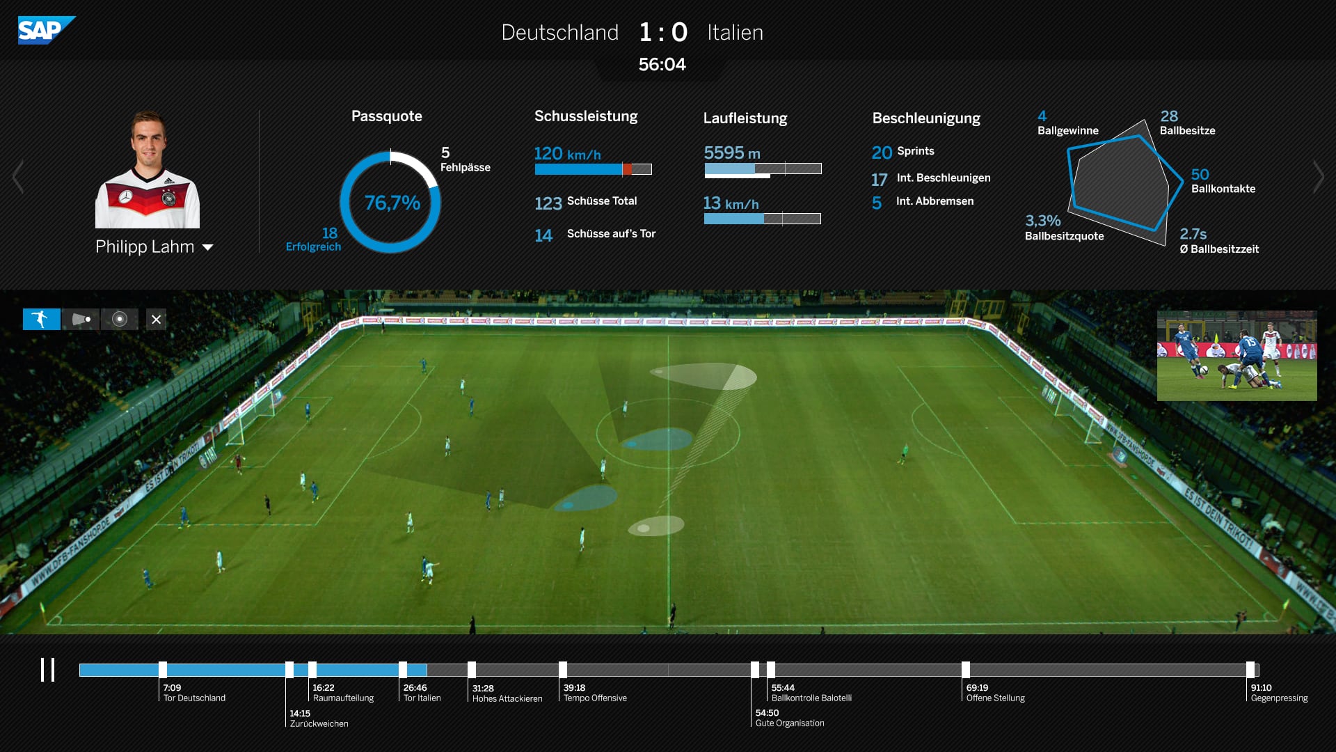 SAP Match Insights, una tecnología que surgió de un proyecto de innovación conjunta entre SAP y la Federación Alemana de Fútbol tiene por objeto facilitar el análisis de la formación, preparación y torneos de cada uno de los jugadores. También, tiene la intención de permitir que los entrenadores procesen grandes cantidades de datos para encontrar y evaluar situaciones claves en cada partido, con el fin de mejorar el desempeño de un jugador específico y el rendimiento del equipo en general.