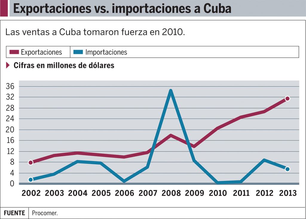 Datos de Procomer indican que los ingresos por exportaciones a Cuba crecieron cuatro veces en 12 años, pasando de $7,8 millones en el 2002 a $31,4 millones en el 2013.