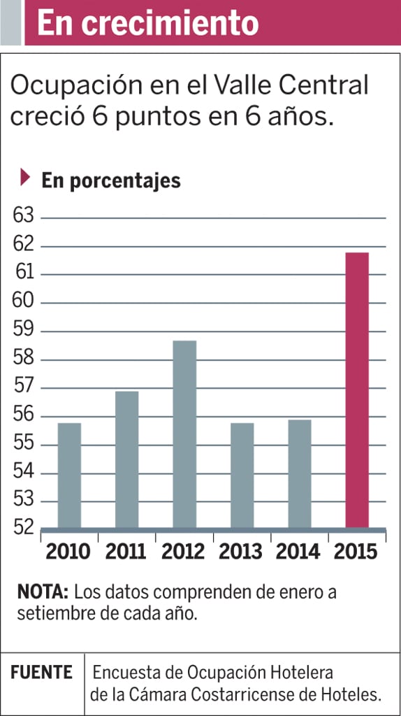 La Encuesta de Ocupación Hotelera, de la Cámara Costarricense de Hoteles, muestra que la ocupación en el Valle Central aumentó seis puntos porcentuales en el periodo del 2010 al 2015.