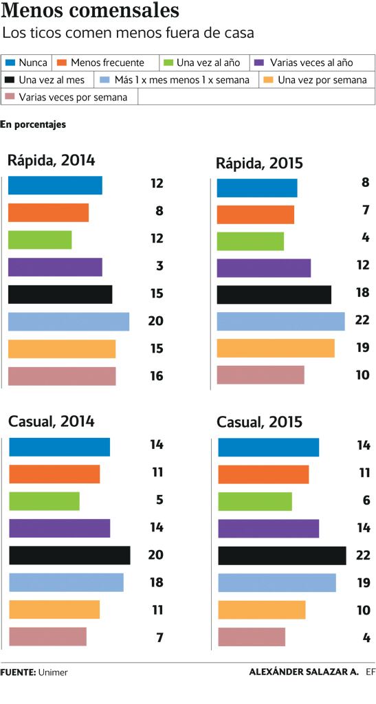 Según el Perfil del Consumidor 2015, los locales de comida rápida son visitados por el 92% de los residentes de la Gran Área Metropolitana (GAM), mientras que, un 86% degusta en los de comida casual.