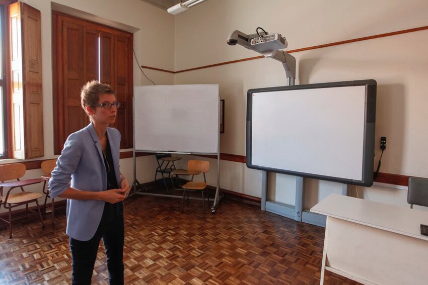 El primer cambio físico es de herramientas: ya incorporaron pizarras o tableros interactivos, que permiten cambiar la dinámica de las lecciones. En ellas se puede proyectar video, escuchar música y aplicar otros elementos multimedia. "Además, por ejemplo, se pueden escribir palabras para que los estudiantes se levanten y las muevan, formando frases o corrigiéndolas", explica Vanmansart. Otra posibilidad es el desarrollo de juegos interactivos.