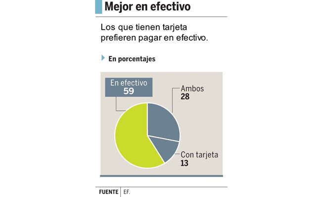 Cuando se trata de artículos de menor precio, también el efectivo es el preferido. Un 99% cancela sus compras en los minisúper con efectivo, el 87% paga con efectivo en las cajas de los supermercados, el 82% paga no usa tarjeta al comprar ropa y un 72% tampoco lo hace al comprar un celular.