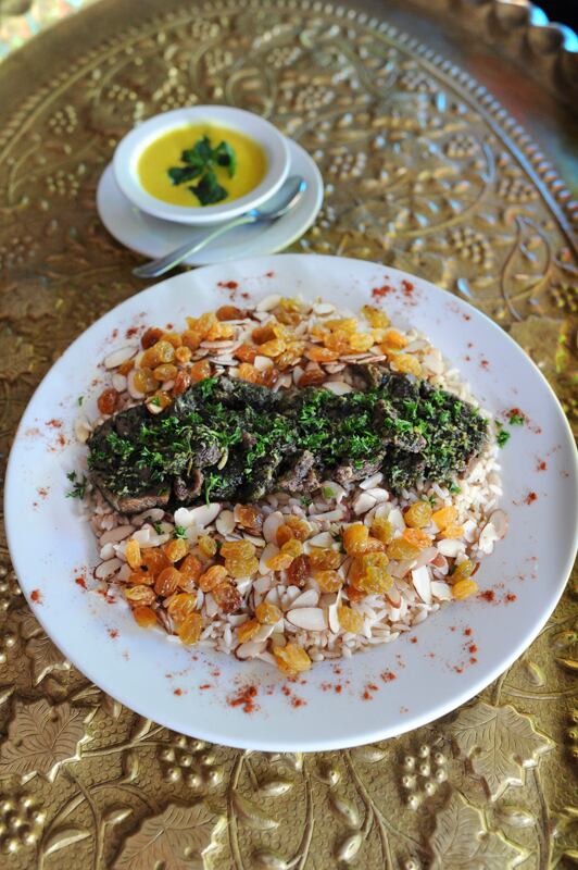 Uzzi. Cordero horneado, con arroz, almendras y pasas doradas. Una de las especialidades, bien emplatado. De gusto delicado, aunque el cordero nos habría gustado un poco más tierno.